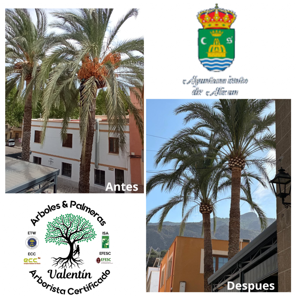 Antes y Después de poda de Palmeras en Ayuntamiento de Alincun ( Almeria )